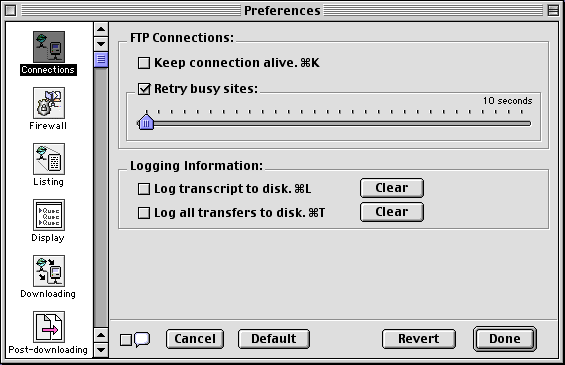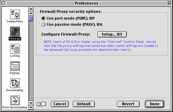- Configure Firewall/Proxy: Opens the Internet Config application (Internet control panel under MacOS 8.5 or greater), allowing you to configure more advanced settings.