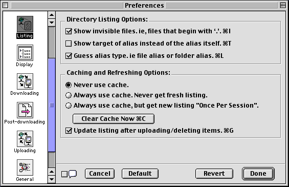 - Cache directory listings. NetFinder can keep a record of the directories it lists. It will then use that record when you next try to get that directory's listing instead of asking the FTP server to send it again. For large directories or slow links, this saves you time so it's better to check this option. If the directory is likely to change often, you should probably have this option checked but use the "Refresh Listing" command in the File menu when you think it has changed.