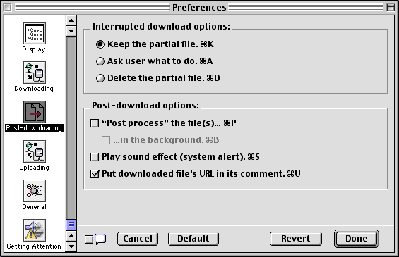 - Put downloaded file's URL in its comment. When checked, NetFinder will put the URL of the downloaded file in the Finder comments of the file.