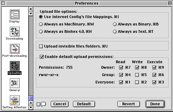 Owner/Group/Everyone/Read/Write/Execute checkboxes: these allow you to change the default upload permissions. Just click the appropriate checkboxes. Most of the time you'll want the "755" permissions setting (only the owner can alter files but everyone else can see them).