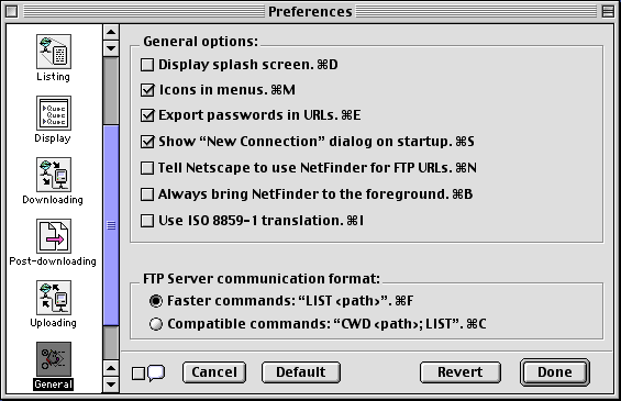 When checked, NetFinder will apple ISO 8859-1 translation to FTP files and folders. This is useful if the site you are connected to uses ISO 8859-1 encoding for its file/folder names. If the site uses only English names, you probably will not need this option on.